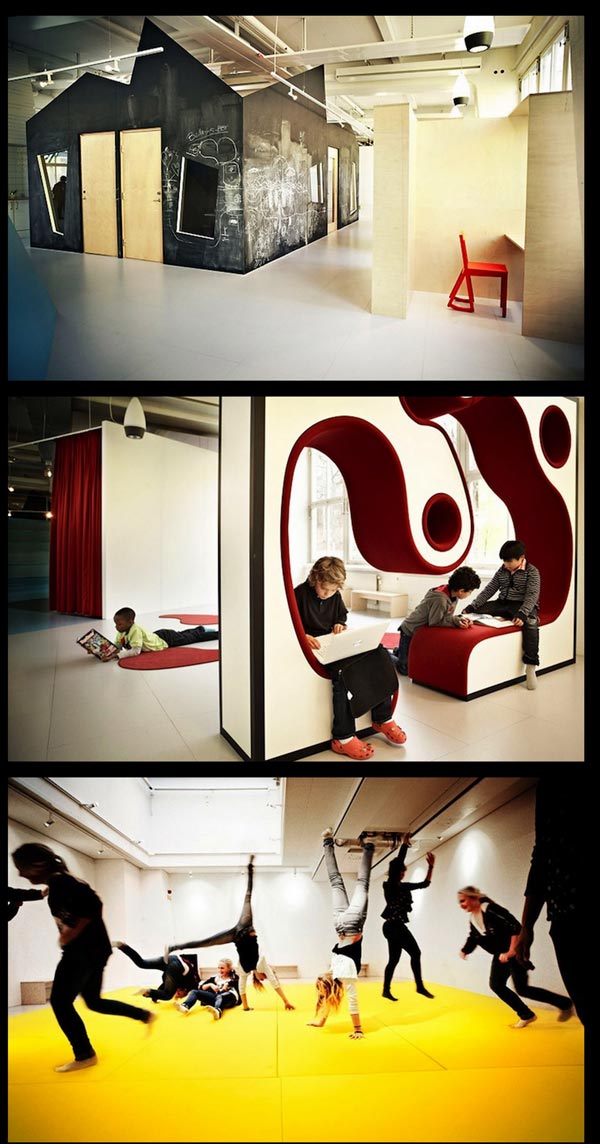 Anyways dibawah ialah Vittra Telefonplan, sebuah sekolah di Stockholm. Sekolah ini direka dengan prinsip kelas tanpa dinding. Ruangan pembelajaran terbuka dan kelas boleh dijalankan dimana-mana didalam 5 zon khas yang diberi nama The Cave, The Lab, The Camp Fire, The Watering Hole dan The Show Off. Setiap satunya mempunyai tema tersendiri.
