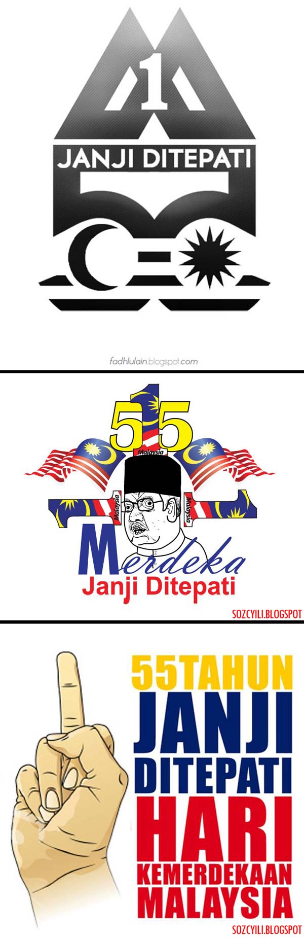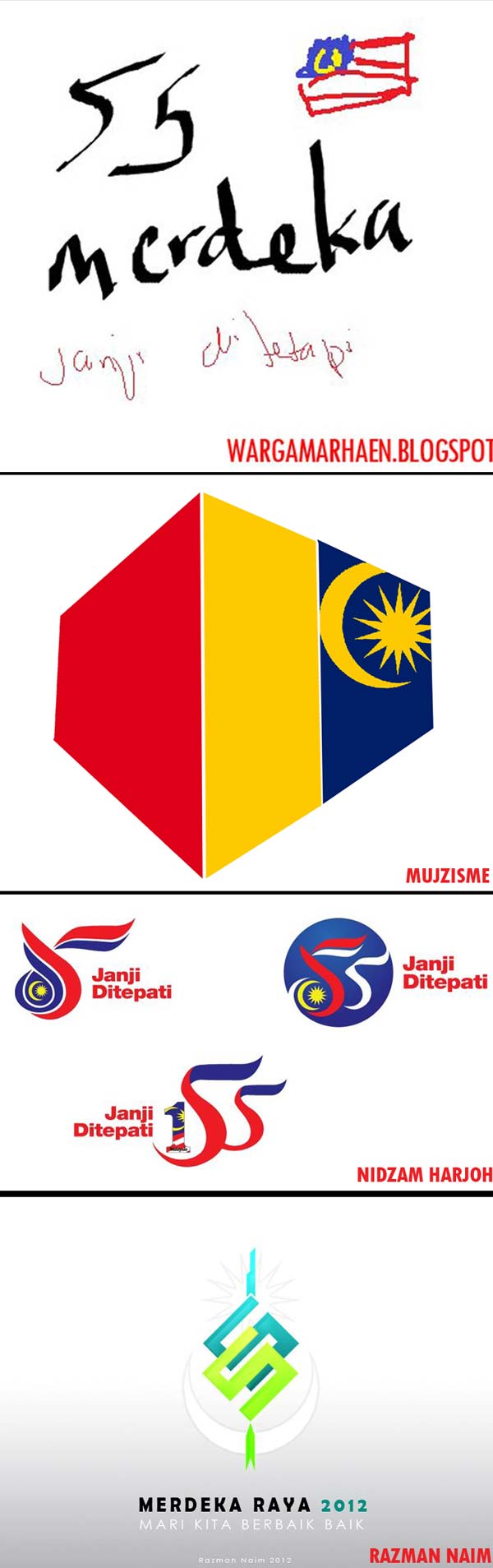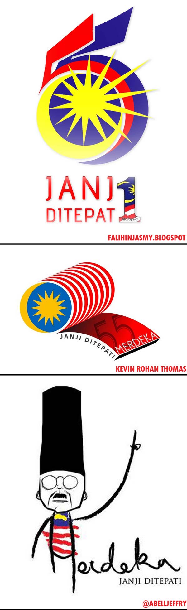 Nampaknya ramai yang tidak puas hati dengan logo hari Merdeka Malaysia yang ke 55 tahun ini. Ramai, terutamanya yang mempunyai latar belakang rekaan grafik merasakan rekaan logo 1Malaysia Janji Ditepati terlalu hodoh dan kelihatan seperti direka oleh budak semester pertama tahun pertama pengajian. Oleh kerana itu sebuah lama Facebook bertajuk "1000 better logos for Malaysia's 55th Merdeka Day" dibuka dan di bawah ialah antara rekaan alternatif yang berjaya kami kutip