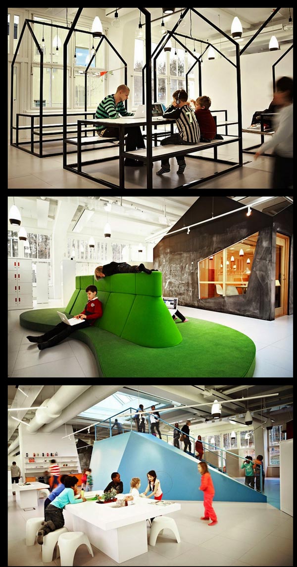 Anyways dibawah ialah Vittra Telefonplan, sebuah sekolah di Stockholm. Sekolah ini direka dengan prinsip kelas tanpa dinding. Ruangan pembelajaran terbuka dan kelas boleh dijalankan dimana-mana didalam 5 zon khas yang diberi nama The Cave, The Lab, The Camp Fire, The Watering Hole dan The Show Off. Setiap satunya mempunyai tema tersendiri.